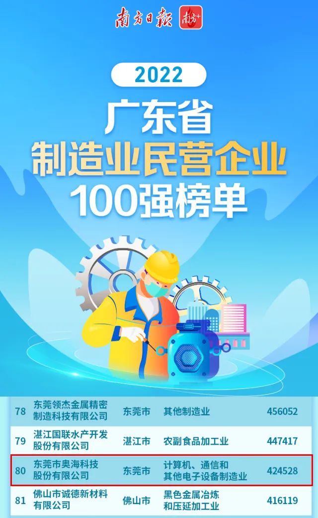 又获奖了!奥海科技入围2022广东省制造业民营企业100强